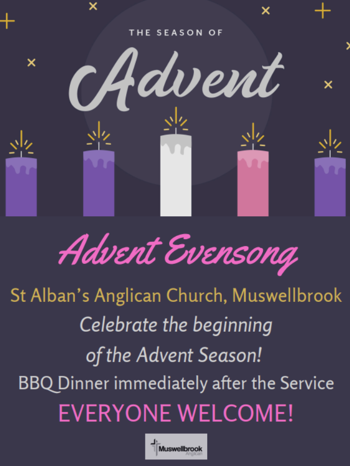 Advent Evensong Sunday 30 November 2025 5:00 pm 7:00 pm St Alban's Anglican Church 25 Hunter Terrace Muswellbrook, NSW, 2333 Australia (map) Google Calendar ICS